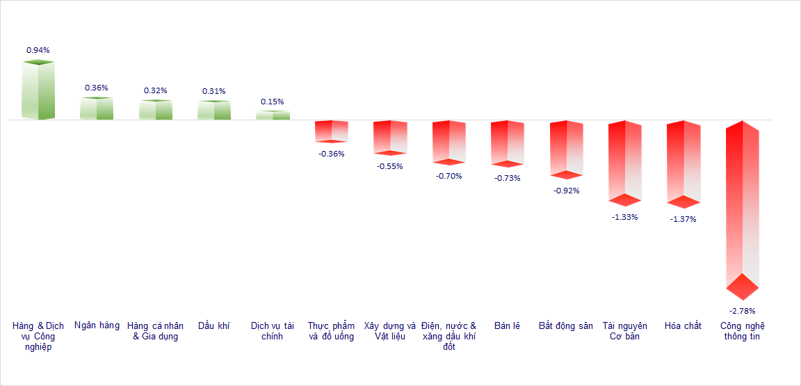 VN-Index có phiên điều chỉnh nhẹ trước thêm đáo hạn phái sinh với áp lực chính đến từ họ nhà Vingroup. Cảng biển, Ngân hàng và Bất động sản dân cư là các nhóm có diễn biến tích cực nhất trong phiên. Trái ngược lại, nhóm Công nghệ, Hóa Chất và F&B lại có diễn biến khá ảm đạm.