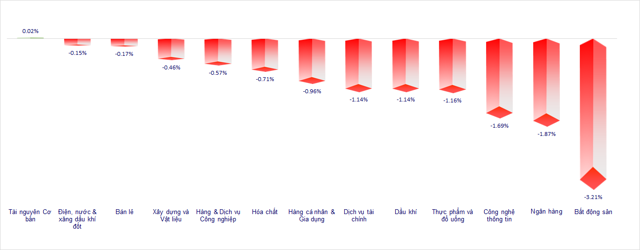 VN-Index hình thành phiên phân phối thứ 2 khi giảm mạnh hơn 35 điểm trước áp lực điều chỉnh của họ nhà Vingroup. Hầu hết các nhóm ngành đều có phiên giảm điểm. Bất động sản, Ngân hàng và Công nghệ là các nhóm có diễn biến tiêu cực nhất trong phiên.