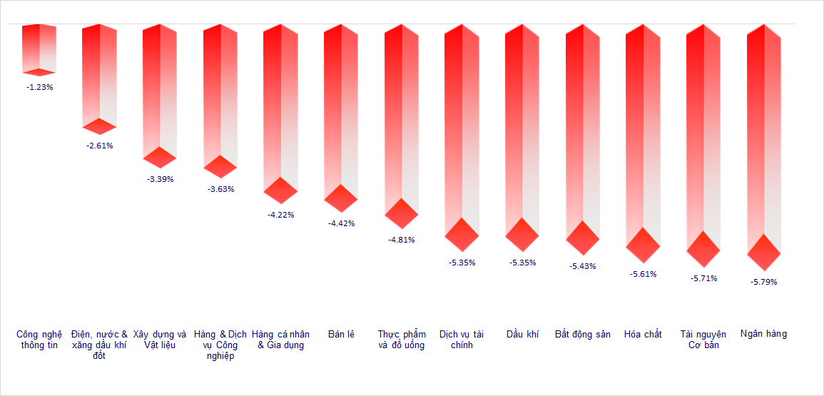 VN-Index có phiên giảm điểm kỷ lục lịch sử khi để mất gần 95 điểm. Hầu hết các nhóm ngành đều diễn biến tiêu cực trong phiên hôm nay, ngoài trừ họ cổ phiếu nhà Viettel là có diễn biến khá tích cực.
