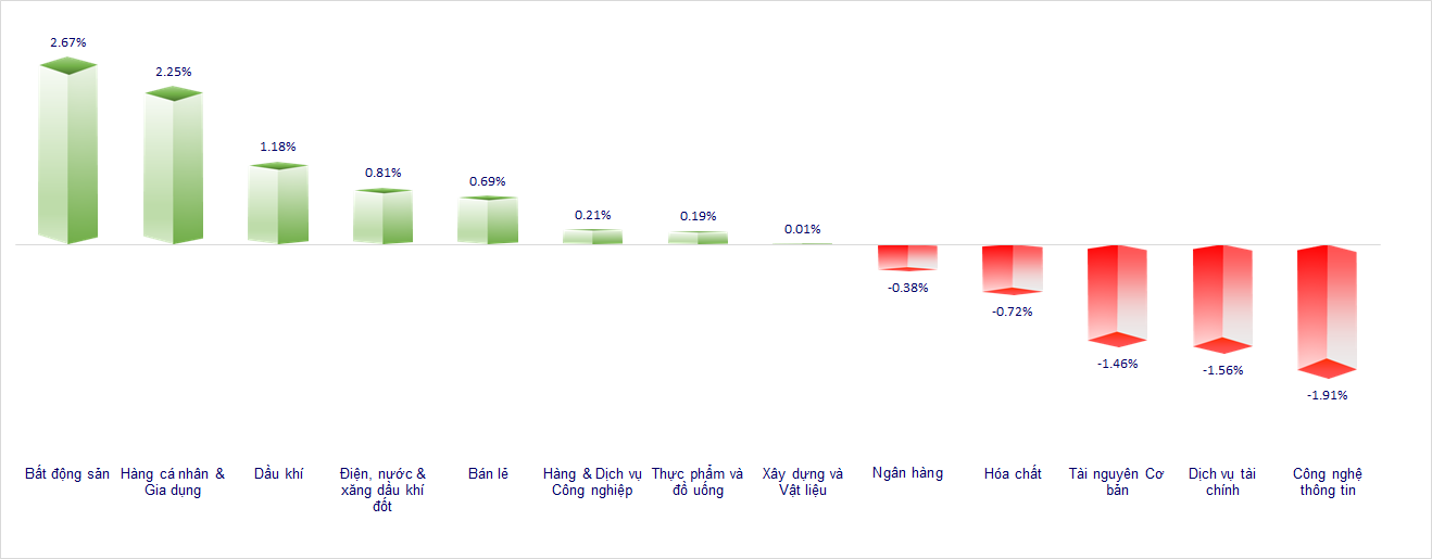 VN-Index tiếp đà tăng gần 10 điểm nhờ họ nhà Vin phục hồi trở lại nhưng thanh khoản mất hút. Bất động sản, Dầu khí và Bán lẻ là các nhóm tăng điểm trong phiên hôm nay. Trái lại, Công nghệ, Chứng khoán và Hóa chất lại có diễn biến khá ảm đạm.