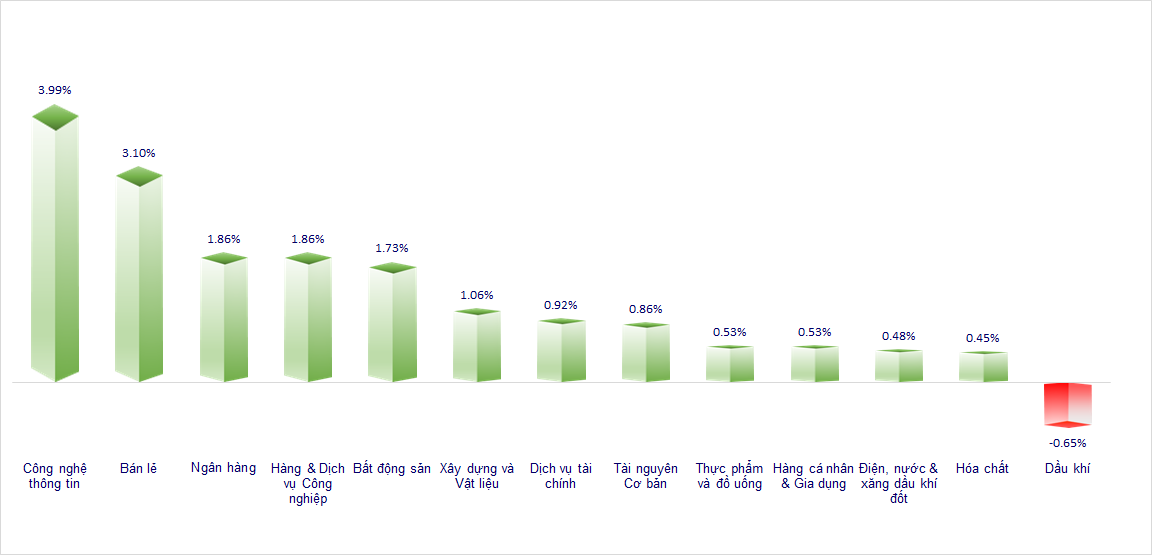VN-Index đảo chiều tăng mạnh gần 60 điểm trong phiên với sự bùng nổ trên nhiều nhóm ngành. Hầu hết các nhóm ngành đều có diễn biến tích cực sau phiên hôm nay với sự nổi bật đến từ các cổ phiếu nhóm Công nghệ, Bán lẻ, Ngân hàng và Bất động sản.