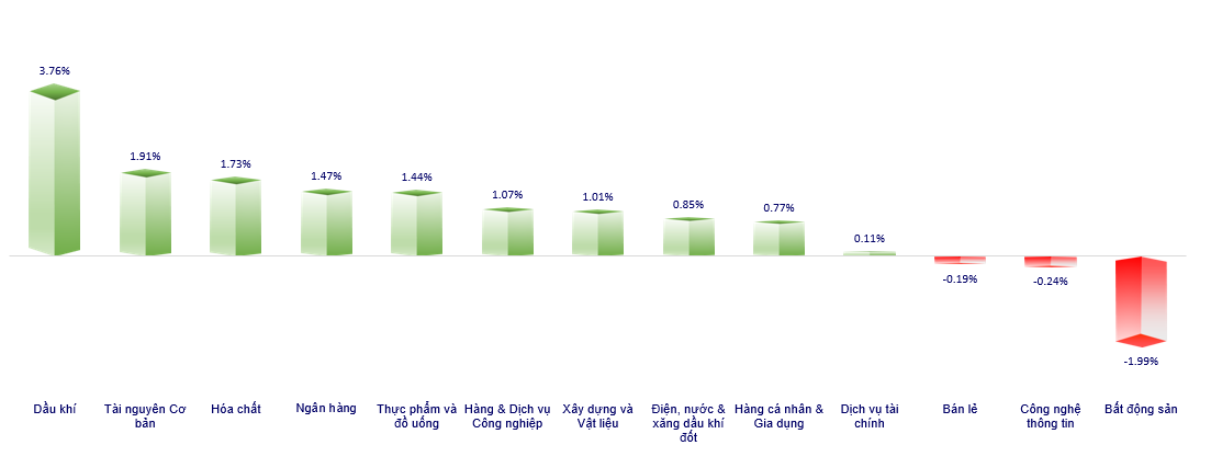 VN-Index rút chân hơn 10 điểm sau phiên ATC sau khi rơi hơn 20 điểm trong 30p cuối phiên giao dịch. Dầu khí, Tài nguyên và Hóa chất là các ngành có diễn biến tích cực nhất trong phiên hôm nay. Trái lại, Bất động sản, Công nghệ và Bán lẻ lại có diễn biến khá ảm đạm.