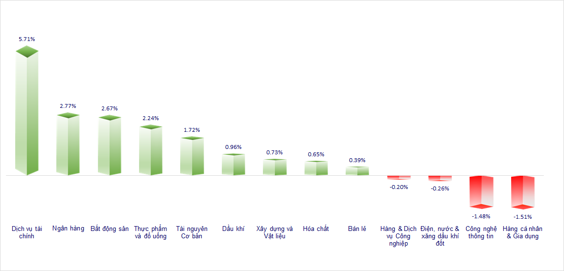 Cụ thể, áp lực bán ra tại nhiều nhóm cổ phiếu tiếp tục diễn ra trong phiên sáng khiến VN-Index chủ yếu giao dịch trong sắc đỏ bất chấp sự tích cực đến từ các cổ phiếu nhóm Ngân hàng, Chứng khoán và họ nhà Vingroup. Nhiều nhóm cổ phiếu điều chỉnh sâu, thậm chí giảm sàn như Xây dựng, BĐS, Công nghệ và Dầu khí. Điều này diễn ra do tình trạng call margin tại nhiều công ty chứng khoán. Tuy nhiên, thị trường bất ngờ phục hồi từ 13h30 và sau đó bùng nổ mạnh mẽ trên nhiều nhóm ngành như Chứng khoán, BĐS và Ngân hàng, giúp cho VN-Index tăng gần 50 điểm chỉ trong hơn 1 tiếng giao dịch và đóng nến phủ nhận hoàn toàn phiên giảm điểm ngày hôm qua.