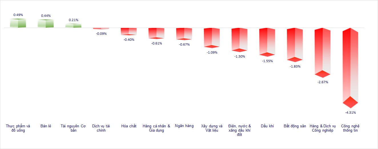 VN-Index bất ngờ bị đạp mạnh cuối phiên với áp lực tới từ họ nhà Vin, Ngân hàng, BĐS và nhóm Gelex. Hầu hết các nhóm ngành đều có diễn biến tiêu cực trong phiên hôm nay, trong đó, tiêu cực nhất là nhóm Công nghệ, Bất động sản và họ nhà Vingroup.