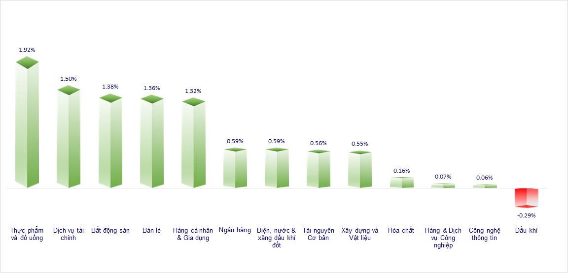 VN-Index phục hồi nhờ lực đẩy từ nhóm cổ phiếu có khả năng được thêm vào rổ FTSE Global All Cap. Hầu hết các nhóm ngành đều có diễn tích cực trong phiên hôm nay. Trong đó, nổi bật nhất là nhóm cổ phiếu F&B, Chứng khoán và Bán lẻ.