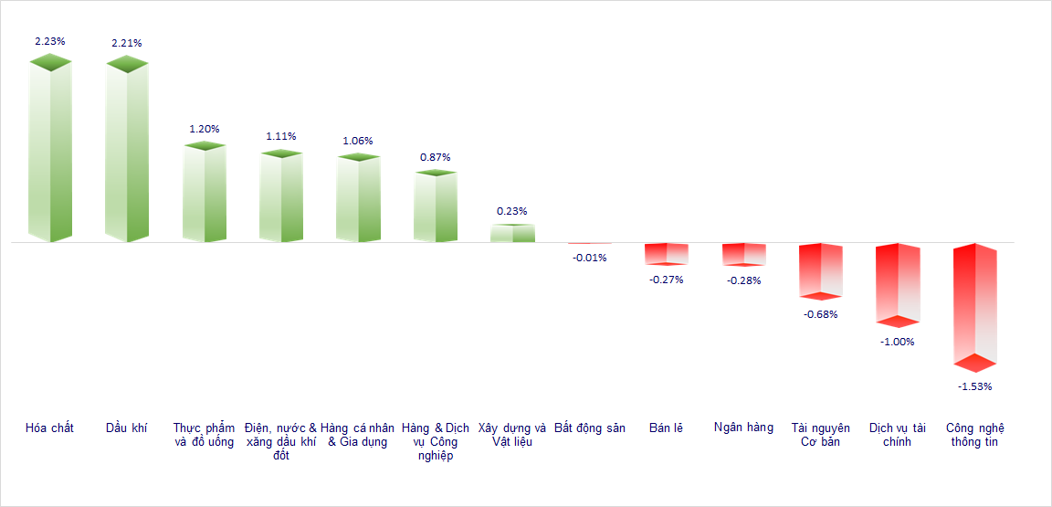 VN-Index điều chỉnh nhẹ với thanh khoản thấp bất chấp khối ngoại xả ròng hơn 1,200 tỷ. Nhóm Hóa Chất, Dầu khí và F&B là các nhóm có diễn biến tích cực nhất phiên hôm nay. Trái lại, nhóm Ngân hàng, Chứng khoán và Công nghệ có diễn biến khá ảm đạm.
