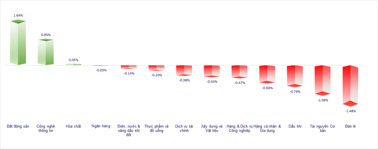 Một số cổ phiếu giảm điểm đáng chú ý khác như Thủy sản (ANV -1.3%, VHC -1.2%), F&B (DBC -1.1%, MML -0.6%, VNM -0.3%), Cảng biển (GMD -0.9%, HAH -0.5%), Dầu khí (PVS -0.6%, OIL -1.9%, PLX -0.9%), Điện (NT2 -0.8%, REE -0.7%), Đầu tư công (VCG và FCN đều -1.6%, KSB -1.3%, CTD -0.9%), Hóa Chất (DCM -1.6%, DPM -0.8%, BFC -1.1%), VGT -2.3%, ACV -1.3%,…