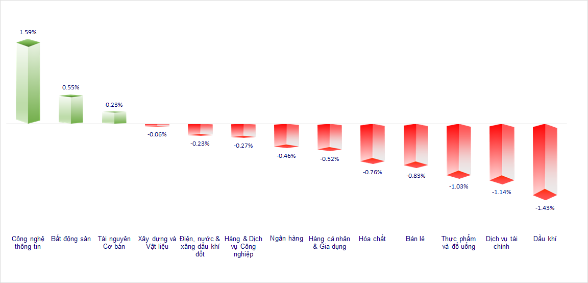 VN-Index rút chân mạnh sau khi lấp gap nhờ sự đảo chiều tăng mạnh của nhiều cổ phiếu trụ. Công nghệ, Bất động sản và Tài nguyên là các nhóm cổ phiếu tích cực nhất ngày hôm nay. Trái lại, nhóm Dầu khí, Chứng khoán và F&B lại có diễn biến khá ảm đạm.