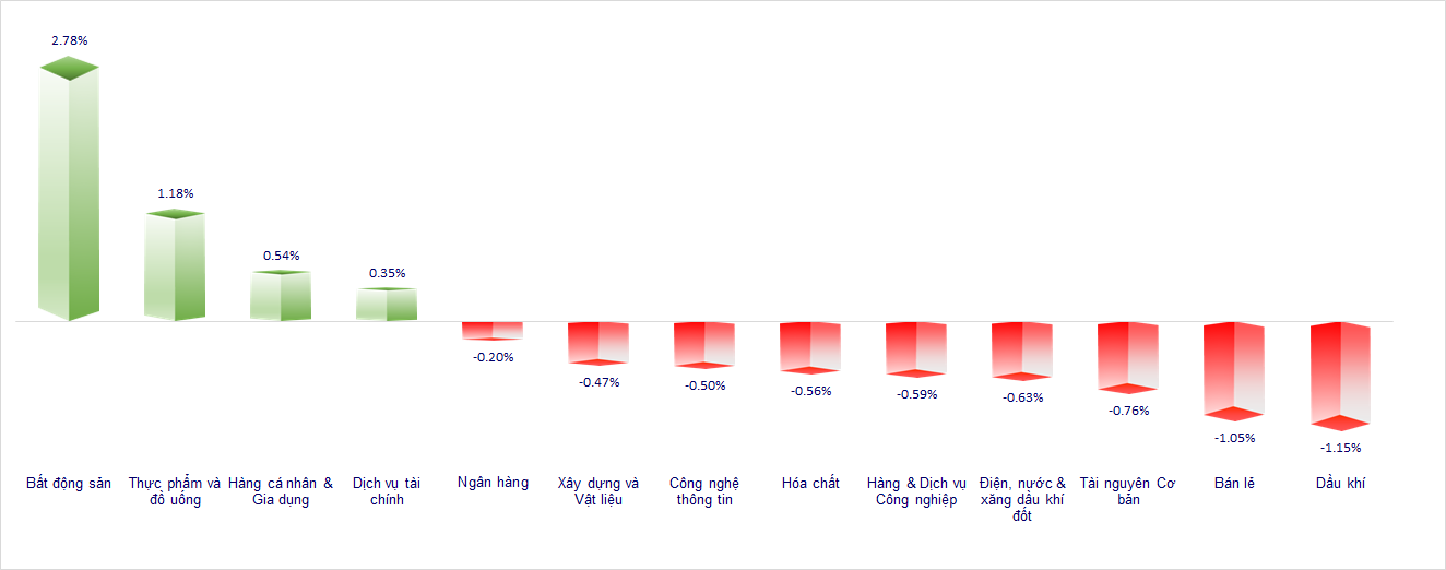 Nhóm Bán lẻ chủ yếu giảm điểm với PET -2.4%, DGW -2.2%, FRT -1.3%, MWG -0.9%, AST -0.1%,… Đáng chú ý là thanh khoản của các cổ phiếu này không có sự gia tăng so với phiên trước, thậm chí một số cổ phiếu như MWG, DGW có khối lượng sụt giảm chỉ bằng 50%.