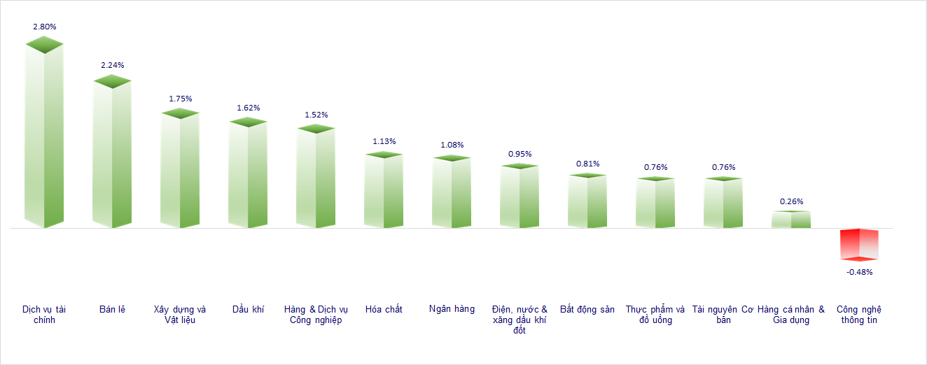 VN-Index bật tăng mạnh khoảng 20 điểm với sự hỗ trợ từ lực gom ròng gần 600 tỷ từ khối ngoại. Hầu hết các nhóm ngành trên thị trường đều tăng điểm trong phiên hôm nay, trong đó tích cực nhất là nhóm Chứng khoán, Bán lẻ, Ngân hàng và Bất động sản.