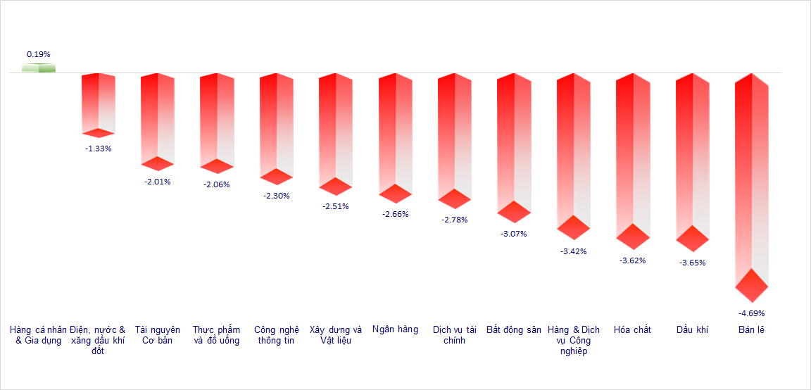 VN-Index có phiên giảm sâu khi hàng loạt nhóm cổ phiếu bất ngờ bị đạp sàn trong 15 phút cuối phiên giao dịch. Trên thị trường ngày hôm nay các nhóm ngành chủ yếu đều giảm điểm với Bán lẻ, Dầu khí và Hóa chất là các nhóm ngành có diễn biến tiêu cực nhất.